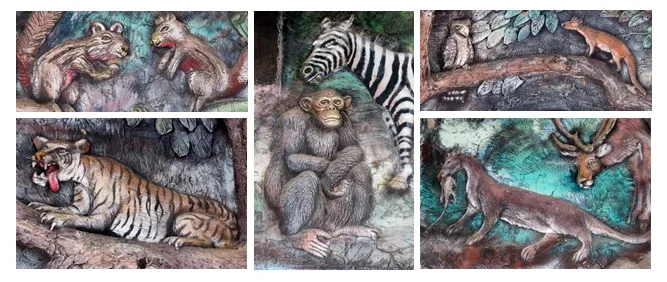 งานศิลปะเหล่านี้ได้รับแรงบันดาลใจจากชีวิตของหลวงปู่โพธิ์ เมื่อครั้งที่ท่านเดินทางไปจำพรรษาในป่าเพื่อบำเพ็ญภาวนาอยู่บ่อยครั้ง ด้านหน้าอาคารจำลองปากทางเข้าถ้ำ และก่อนที่จะถึงถ้ำที่เหมาะแก่การวิปัสสนา พระสงฆ์จำเป็นต้องเดินผ่านป่าเปลี่ยวที่เต็มไปด้วยอันตรายจากสัตว์ป่าและอื่นๆ ดังนั้นการเดินมาถึงถ้ำได้ จึงหมายถึงการพิชิตความยากลำบากไปแล้วขั้นหนึ่ง ภาพวาดฝาผนังเกี่ยวกับธรรมชาตินี้ทอดยาวไปตลอดจนรอบตัวอาคาร ปัจจุบันมีทั้ง นก ค้างคาว และ ต่อ มาทำรังอยู่ตามบริเวณต่างๆของรูปปูนปั้น ทำให้ป่าเสมือนจริงมากขึ้น