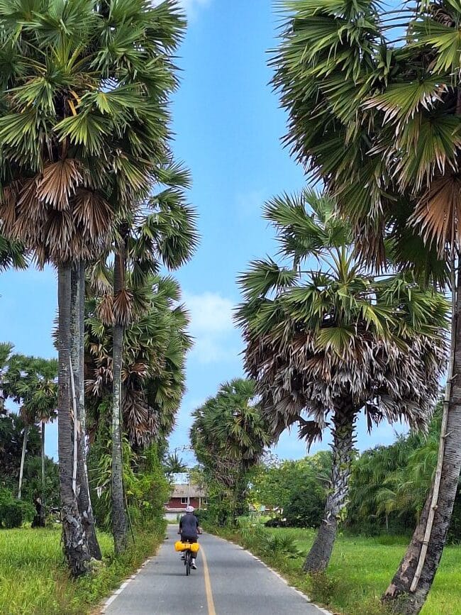 เราปั่นเดือนมกราคม-ต้นกุมภาพันธ์ แทบไม่มีฝนที่ภาคใต้แล้ว เว้นแต่มีบางช่วงที่เราสู้กับลมแรงและแดดจัดจนเป็นไข้ต้องหยุดพักถึงสามสี่วัน เส้นทางอื่นปั่นมาสามสี่ปีเราไม่เคยเป็นไข้ระหว่างเดินทาง ภาคใต้สมบุกสมบันเรื่องภูมิอากาศ แต่ถ้าวันไหนได้ปั่นตามสวนก็จะเย็นสบาย เพราะมีร่มต้นไม้และลมตลอดทาง