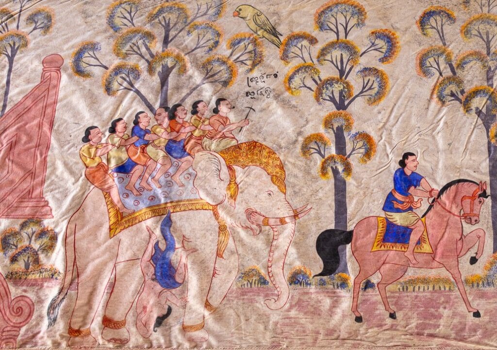 A group of disgruntled residents came to tell the king that Prince Vessantara had given away elephants, horses, and other things.