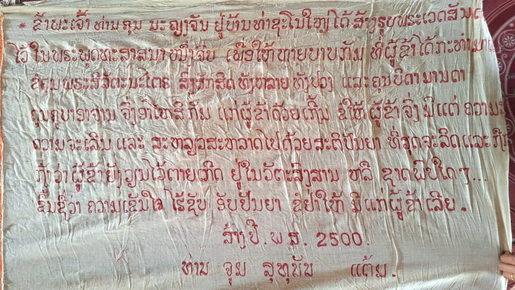 ในช่วงสุดท้ายของผ้าพระเวสได้เขียนรายละเอียดเป็นอักษรลาวที่ใช้ในช่วงเวลานั้น โดยแปลเป็นไทยได้ว่า..