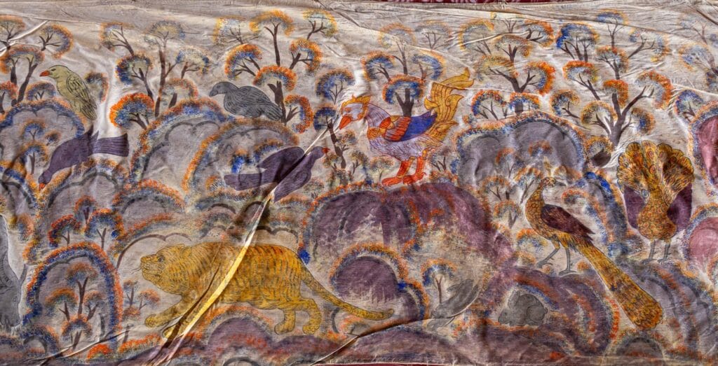 สำหรับผ้าผืนนี้ไม่ได้ถูกนำออกมาแห่งานบุญพระเวสทุกปี เพราะที่หมู่บ้านจะเวียนวัดจัดงาน กว่าจะวนมาถึงคิวของวัดนี้บางทีก็สามปี ทำให้ผ้าพระเวสที่วาดเมื่อปี พ.ศ.2500 หรือเกือบเจ็ดสิบปีที่แล้ว ยังดูมีสีสดใหม่ ประกอบกับเนื้อผ้าฝ้ายที่ทอไว้อย่างแน่นหนา ทำให้ผ้าค่อนข้างแข็งแรงไม่มีรอยขาด ผ้าพระเวสผืนนี้เขียนเรื่องราวพระเวสสันดรยาวเกือบ 80 เมตร ซึ่งยาวกว่าผ้าพระเวสในภาคอีสานบ้านเรากว่าเท่าตัวเลยทีเดียว
