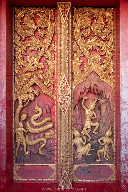 จากภาพแกะสลักที่บานประตูและหน้าต่างที่ชั้น 7 ของพระมหาธาตุแก่นนคร วัดหนองแวงพระอารามหลวง จังหวัดขอนแก่น ได้บอกเล่าเกี่ยวกับ 10 พระชาติสุดท้ายของพระพุทธเจ้า โดยมีช่างผู้รับเหมาหลักคือ นายช่างถาวร ก่อนแก้ว กับชาวภาคเหนือ